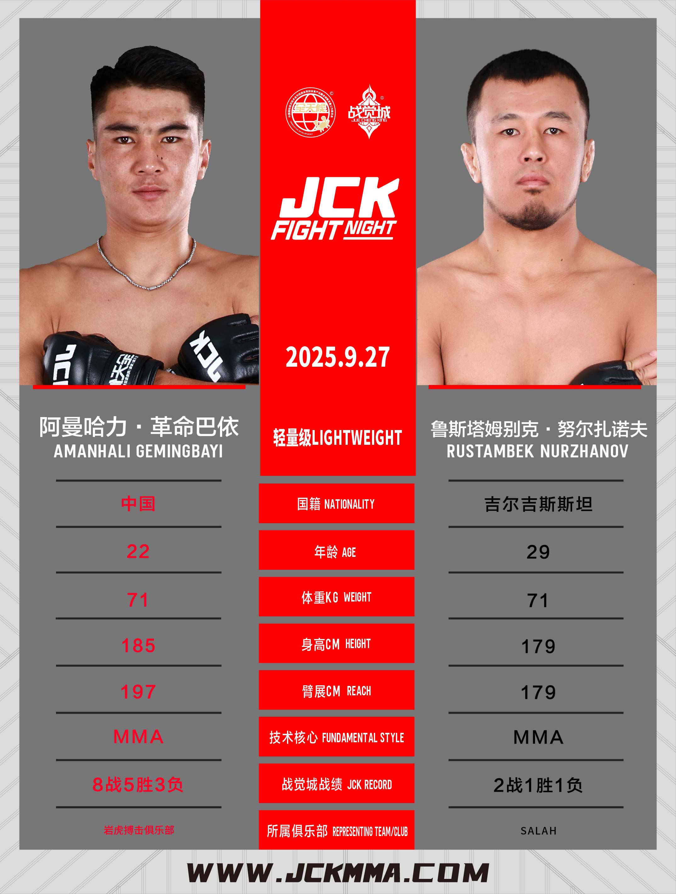 魯斯塔姆別克·努爾扎諾夫,JCK戰覺城輕量級官方排名第五,曾獲得Alash Pride冠軍,在JCK戰覺城2戰1勝。