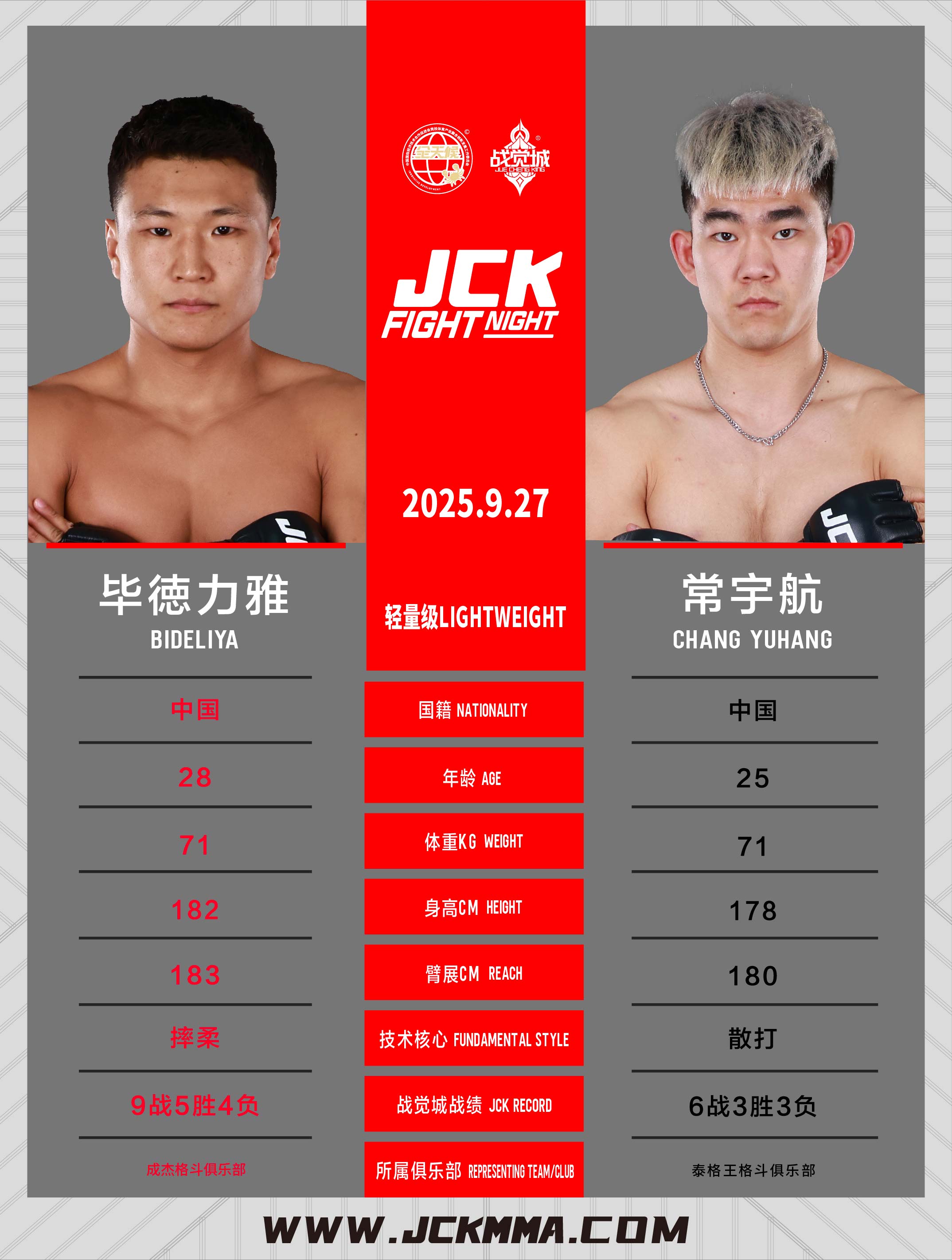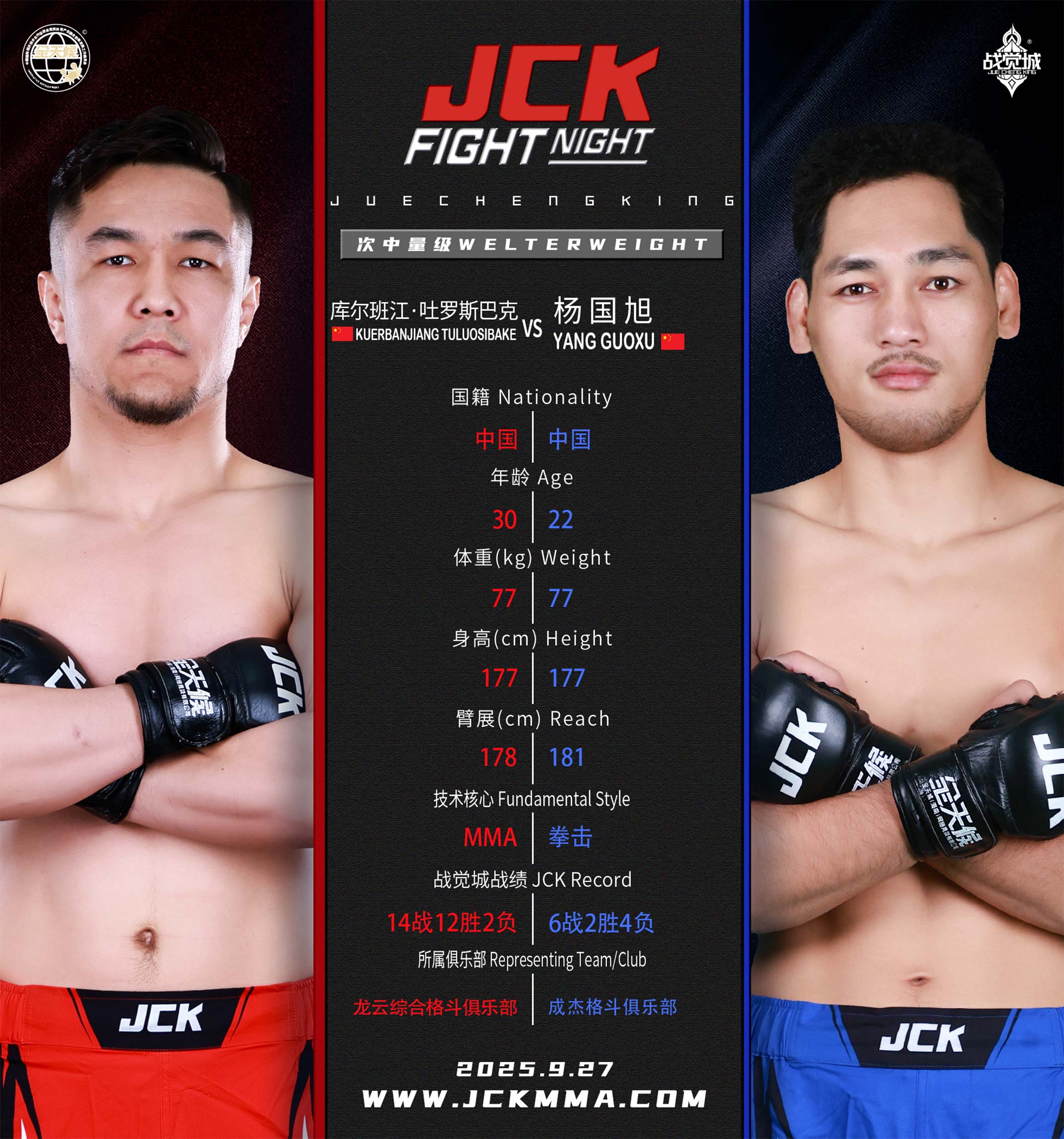 本周迎雙賽!2025年9月27日,JCK覺城之夜N105拉開輕量級、次中量級賞金賽的序幕。輕量級賞金賽1/4決賽陣容:艾力·木拉特別克VS楊朝旭、阿曼哈力·革命巴依VS魯斯塔姆別克·努爾扎諾夫、畢徳力雅VS常宇航、圖拉·那木楠巴雅爾VS比多拉·葉爾哈力;次中量級賞金賽1/4決賽陣容:庫爾班江·吐羅斯巴克VS楊國旭、色吉拉胡VS阿利森·巴博薩、阿吉蘭·塔尼加薩拉姆VS王奇、亞歷山大·齊里亞諾夫VS安迪。