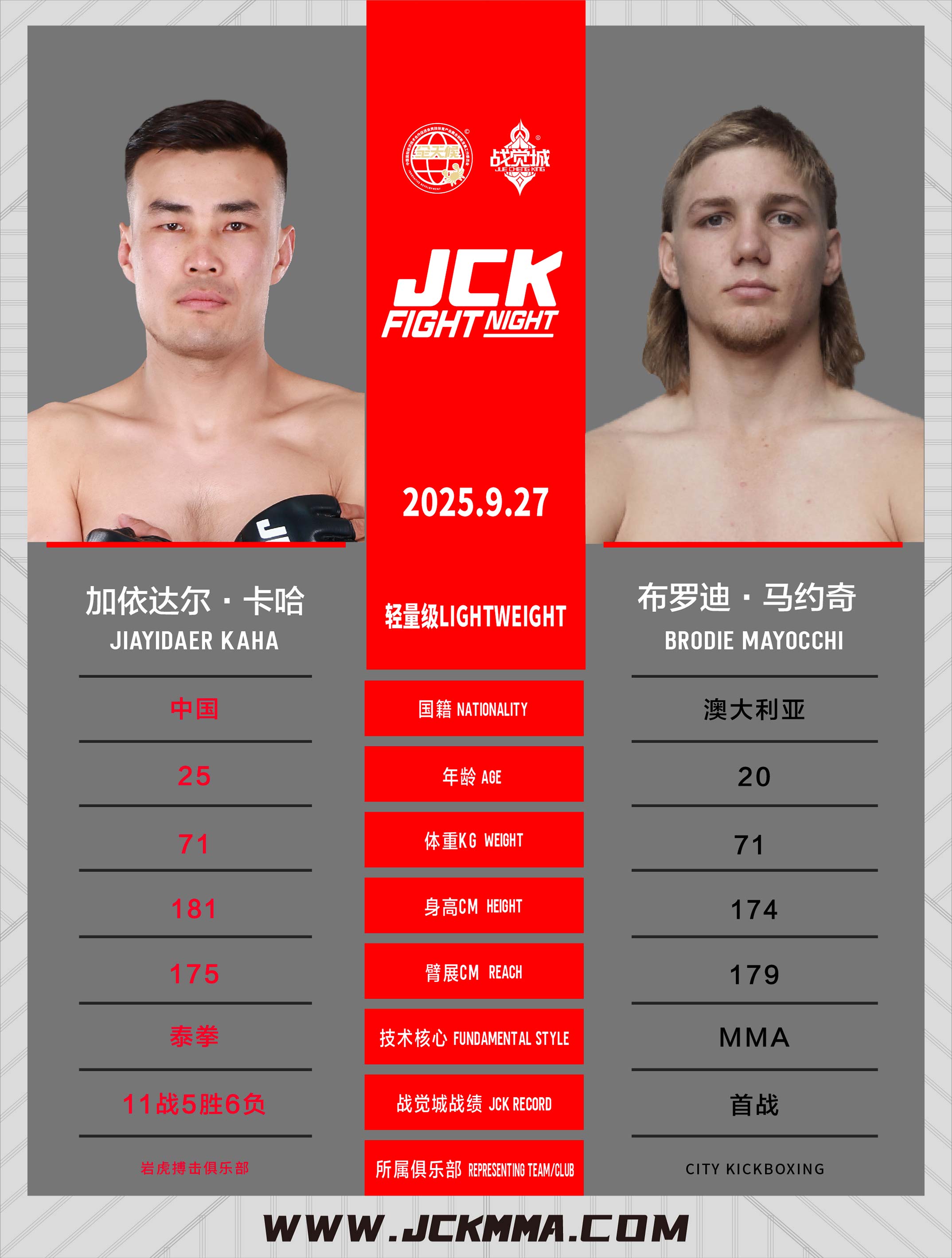 加依達爾·卡哈,以泰拳為技術核心,在JCK戰覺城11戰5勝,曾TKO帕維爾,一致判定戰勝余雷、趙國安、羅周江措。