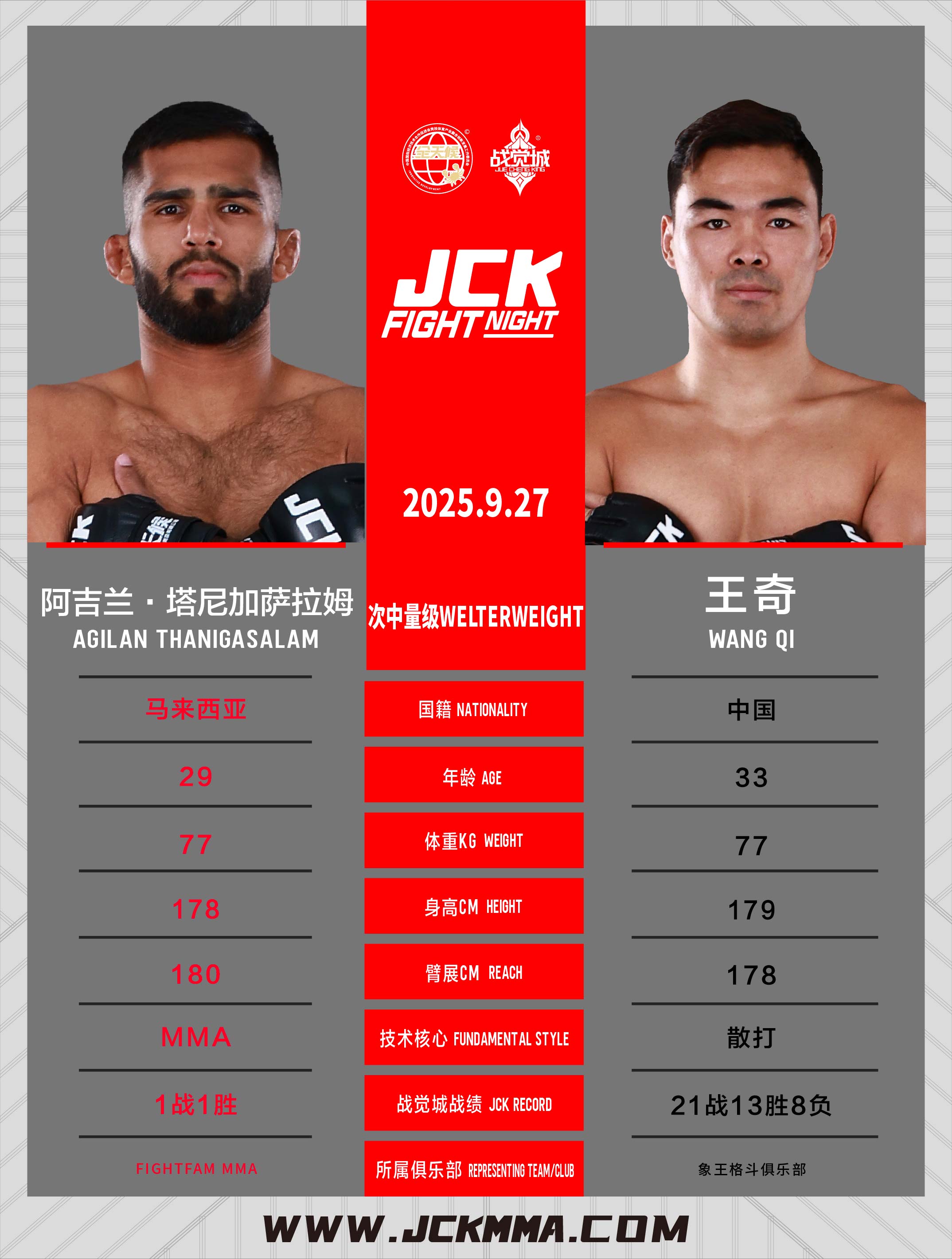 阿吉蘭·塔尼加薩拉姆,JCK戰覺城次中量級官方排名第二,曾爭奪過相關賽事金腰帶,在JCK戰覺城1戰1勝。