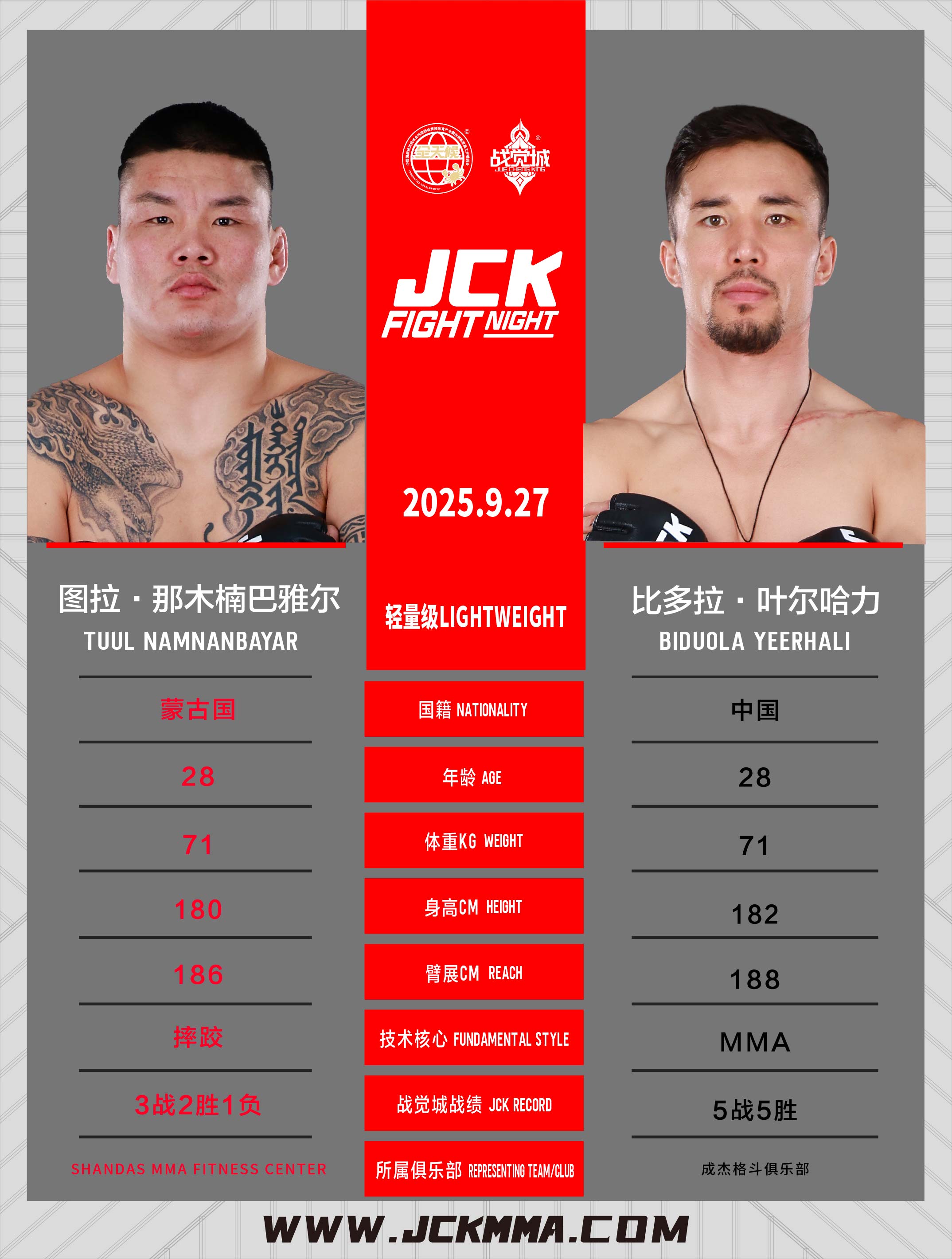 圖拉·那木楠巴雅爾,JCK戰覺城輕量級官方排名第二,曾獲得2021年全蒙古國業余桑搏冠軍、2022年全蒙古國業余MMA冠軍、2023年全蒙古國泰拳冠軍、2023年全蒙古國業余SHOOTBOX冠軍,目前在JCK戰覺城3戰2勝。