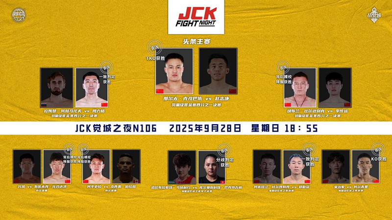2025年9月28日,JCK覺城之夜N106結束,頭條主賽那爾太·克孜巴依25秒TKO趙志康;正賽部分騰力格一致判定戰勝拉姆贊·阿赫馬托夫,胡布蘭·吐爾遜別克背后裸絞降服李恒遠;副賽部分斯依木克·托合達洪、阿平史拉均背后裸絞降服對手,庫爾曼別科娃·巴克特古麗分歧判定戰勝哈比布拉耶娃·馬赫利約,鄭勤獲一致判定戰勝阿依提江·吐爾得別克,阿爾赤里36秒KO宋治家。