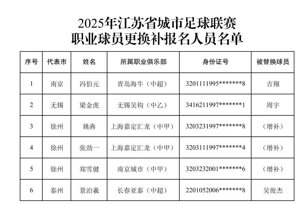 根據規定,“蘇超”淘汰賽前可以對3名職業球員進行調整,圖為各隊調整結果。
