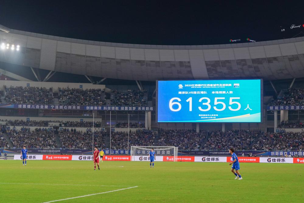 10月4日,在江蘇南京舉行的2025江蘇省城市足球聯賽(“蘇超”)四分之一決賽中,南京隊主場與連云港隊在常規時間1比1戰平,通過點球大戰,南京隊以5比3的總比分戰勝連云港隊,晉級半決賽。大屏幕顯示本場比賽共有61355名球迷到場觀賽。新華社記者 李博 攝