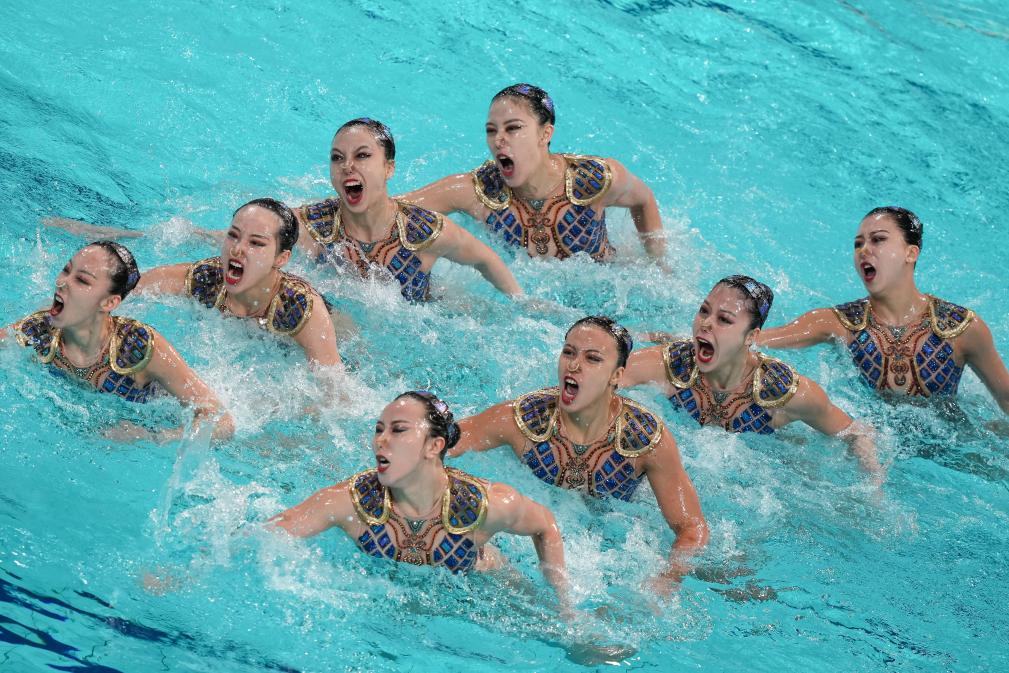 6月15日,中國隊在2025年花樣游泳世界杯總決賽集體技巧自選決賽中。新華社記者 鄒競一 攝