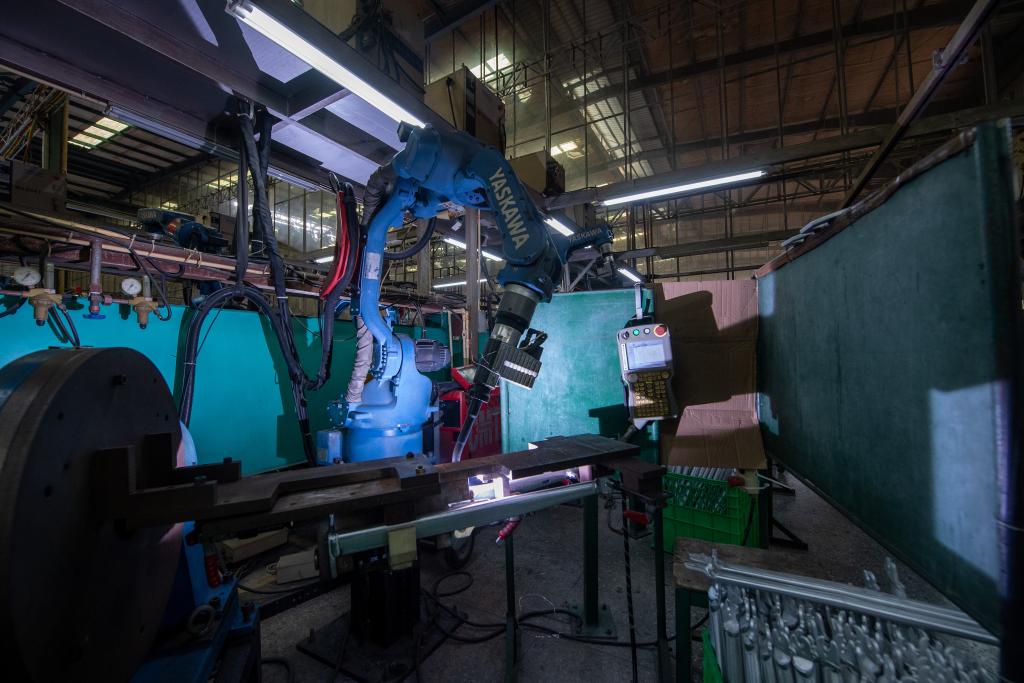 在深圳市喜德盛自行車股份有限公司生產線,機械臂正在焊接車架。新華社記者 毛思倩 攝