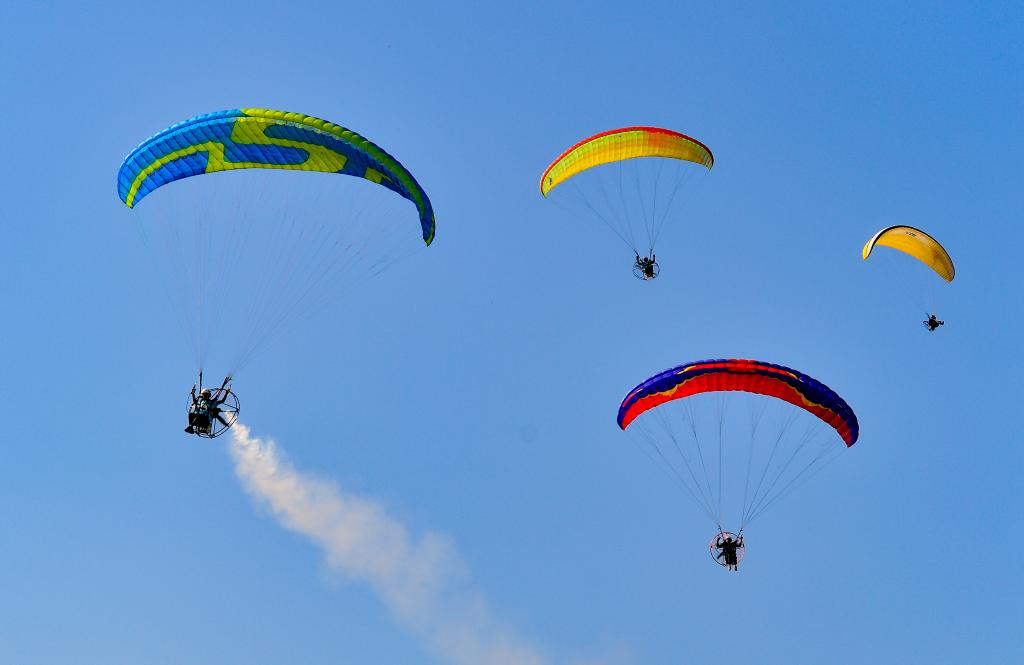 動力傘運動員在烏蘭察布草原飛行大會上進行飛行表演。新華社發(王正攝)