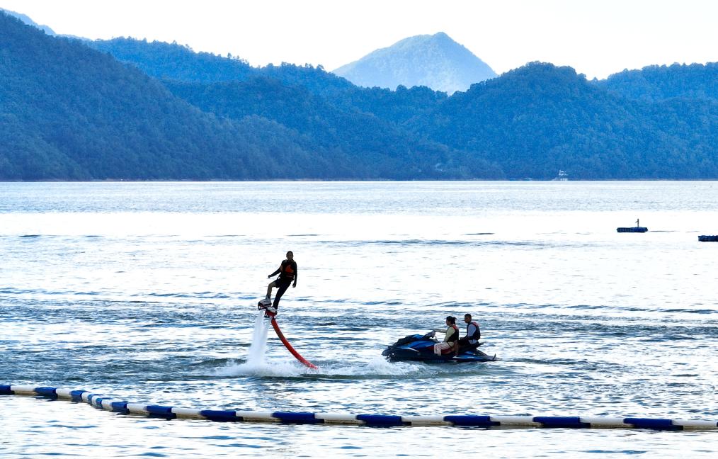 8月28日,游客在黃山市黃山區太平湖水上運動中心體驗水上項目。新華社記者周牧攝