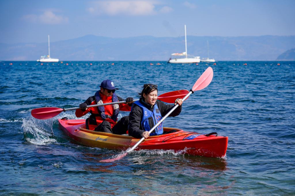 在云南省玉溪市撫仙湖,游客(右)在教練員帶領下體驗皮劃艇。新華社記者王靜頤攝