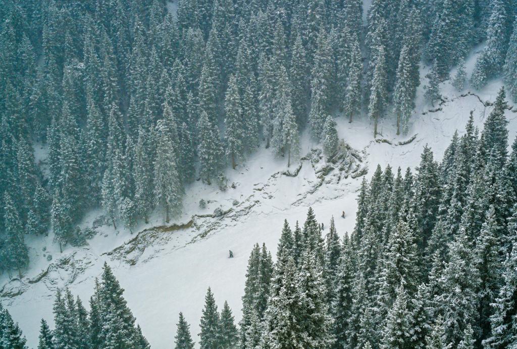 游客在新疆烏魯木齊絲綢之路山地度假區滑雪(2025年1月23日攝,無人機照片)。新華社記者陳朔攝
