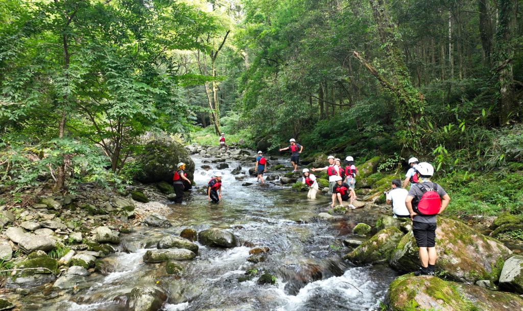 8月24日,游客在黃山市黟縣五溪山風景區體驗溯溪(無人機照片)。新華社發(汪澄攝)