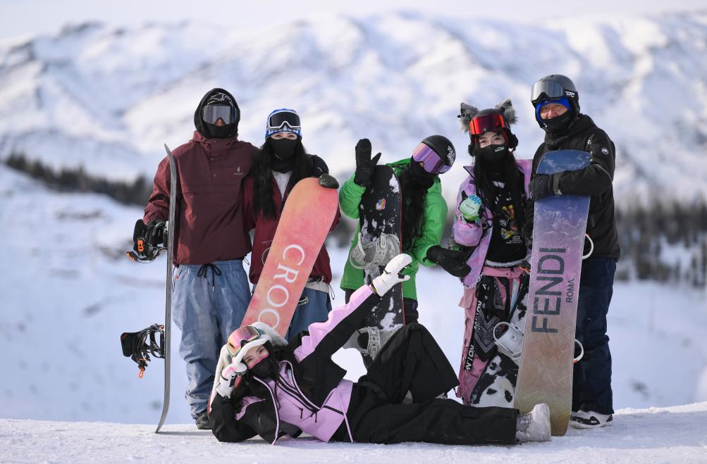 2025年1月28日,來自浙江的“95后”姑娘張琦彬(前)與一起滑雪過年的同伴們在新疆阿勒泰將軍山國際滑雪度假區合影。新華社記者胡虎虎攝