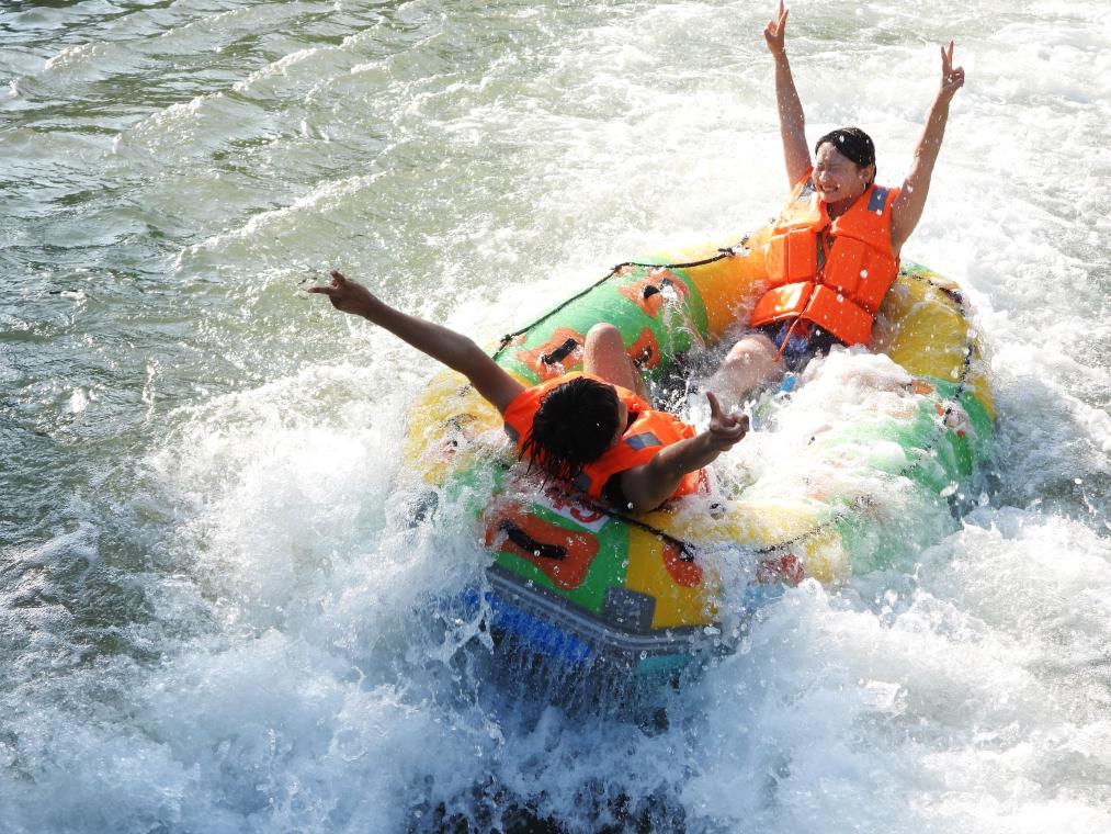 在四川省達州市渠縣賨人谷景區,游客在漂流。新華社發(鄧良奎攝)