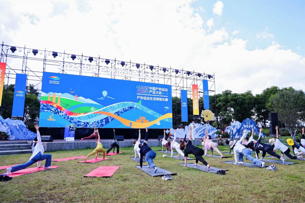 在2025中國戶外運動產業大會戶外運動生活體驗長廊,人們在參與戶外瑜伽活動