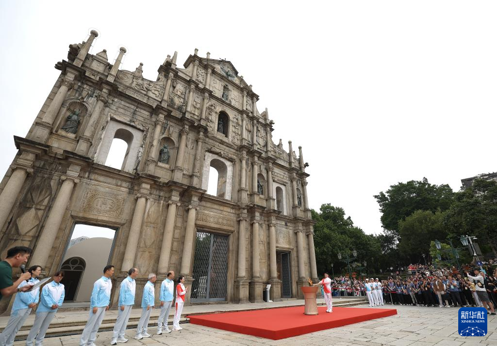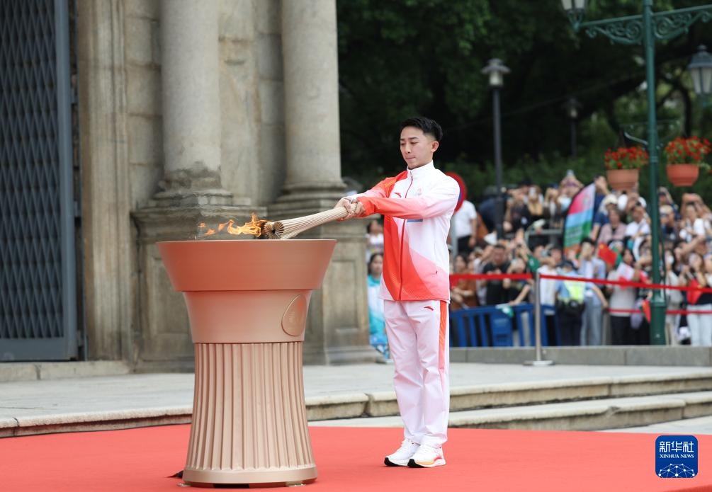 11月2日,火炬手郭建恒(中)在大三巴牌坊前點燃圣火盆。