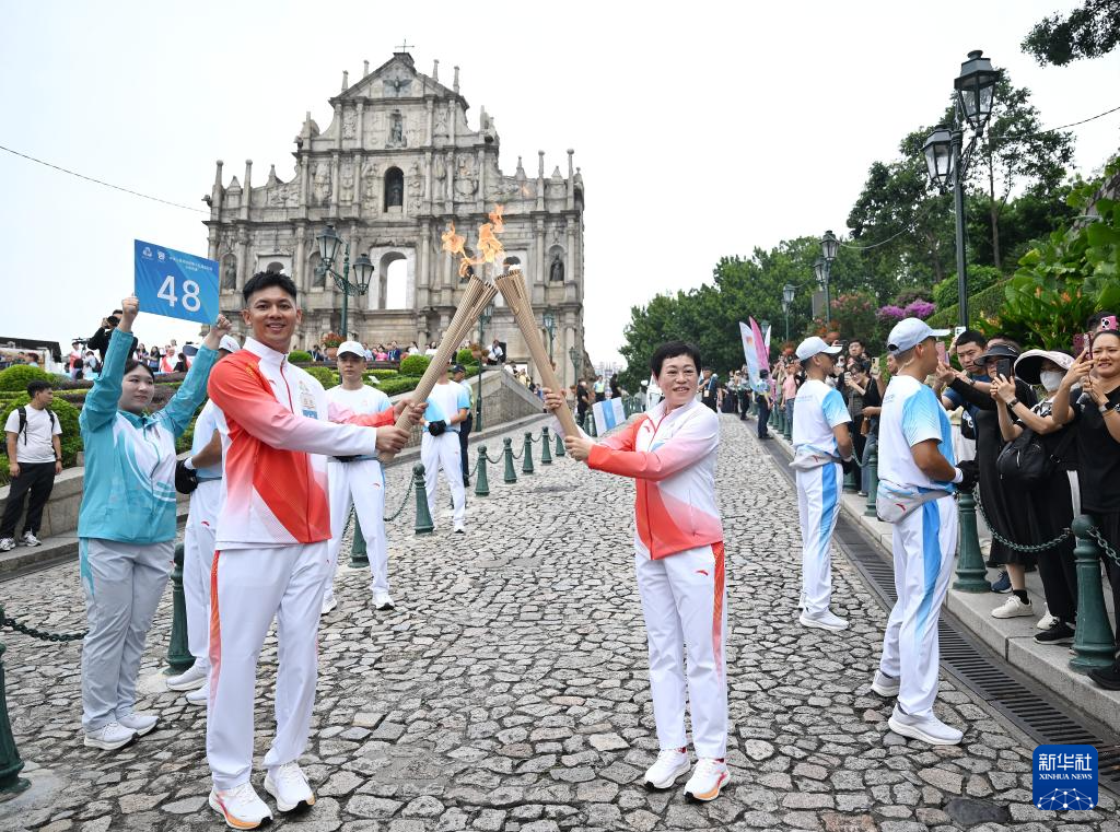11月2日,火炬手郭建恒(右)、區海欣在大三巴牌坊前傳遞火炬。