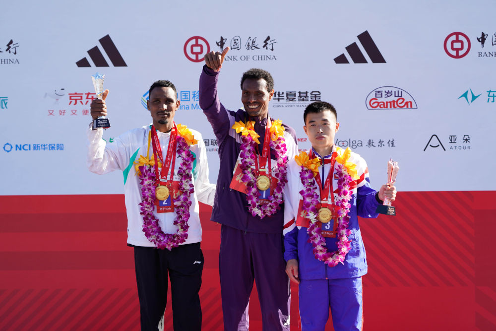 11月2日,男子組冠軍埃塞俄比亞選手哈耶爾(中)、亞軍埃塞俄比亞選手德貝爾(左)、季軍朝鮮選手韓日龍在頒獎儀式上合影。新華社記者 謝晗 攝
