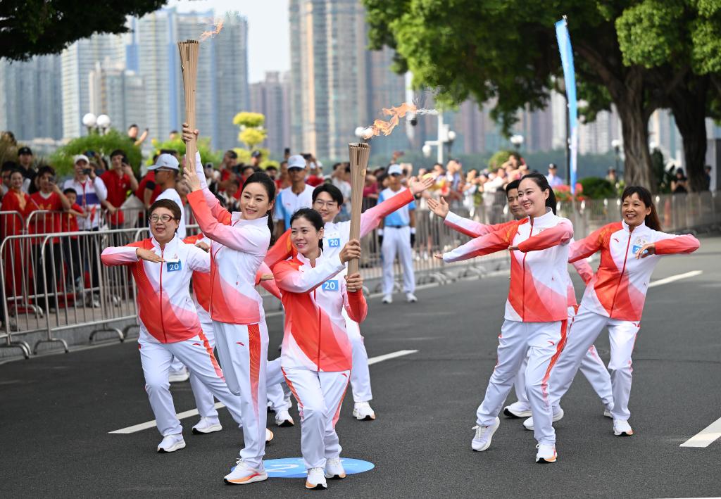 ↑火炬手關恩賜(右一)與十五運會和殘特奧會志愿者團隊火炬手在傳遞活動中。新華社記者 黃偉 攝