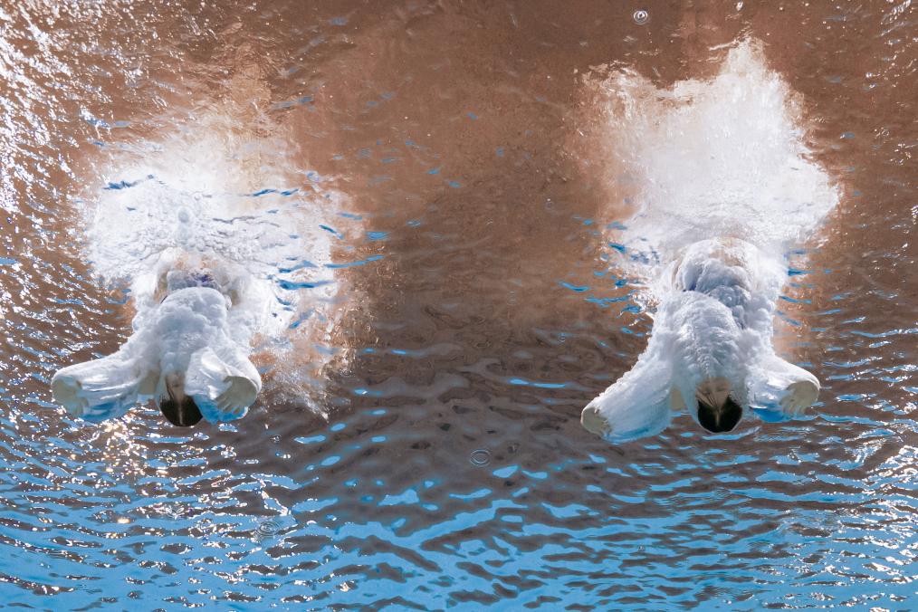 ↑11月2日,廣東隊組合全紅嬋/王偉瑩在跳水女子團體賽雙人10米跳臺項目比賽中。新華社記者 夏一方 攝