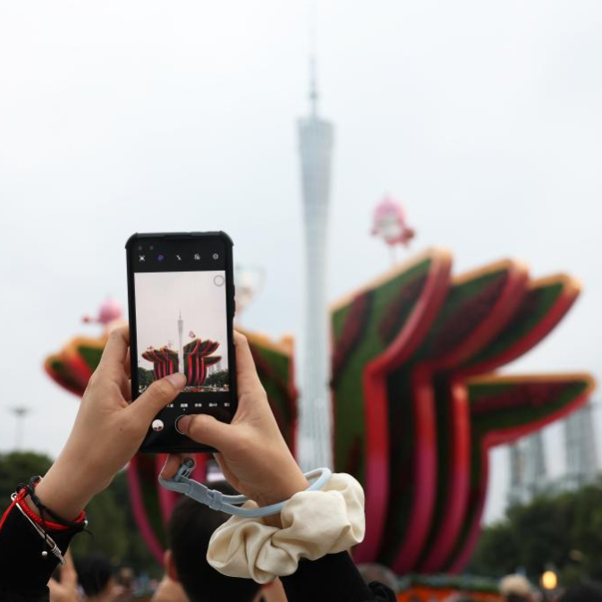 11月9日,游客在廣州花城廣場拍攝全運會景觀和廣州塔。