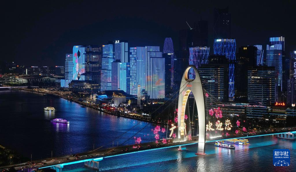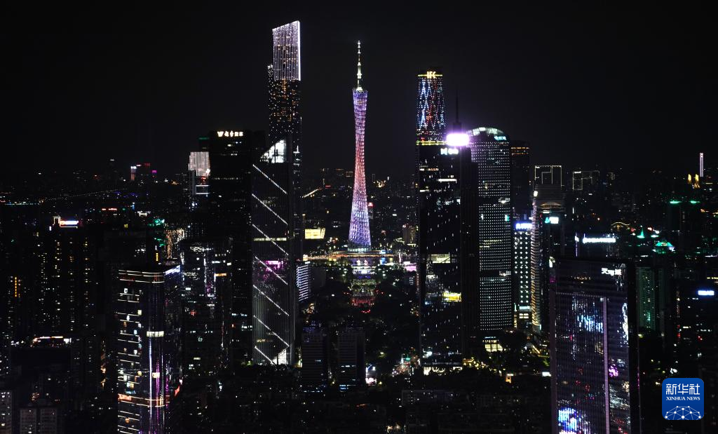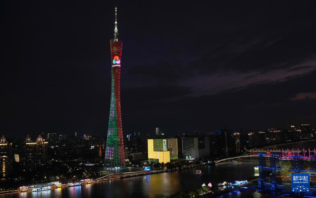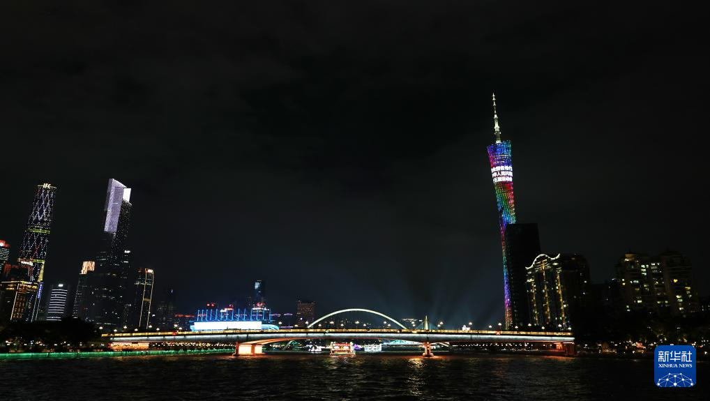 11月9日,廣州珠江沿岸的建筑點亮第十五屆全國運動會主題燈光。