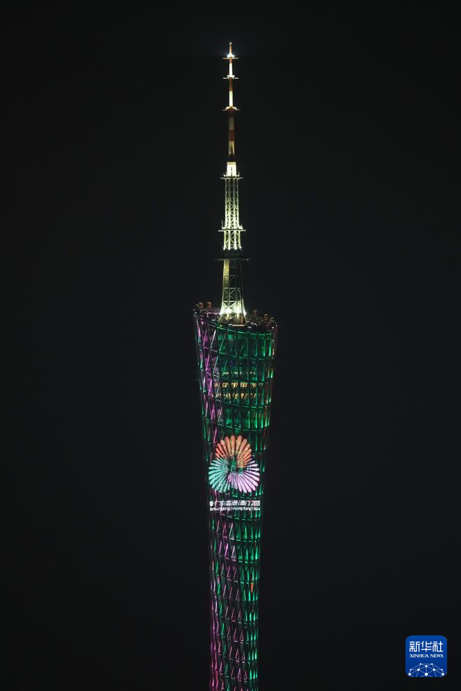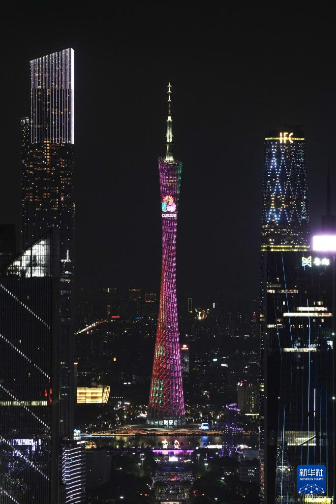 這是11月9日拍攝的點亮第十五屆全國運動會會徽圖案燈光的廣州塔。