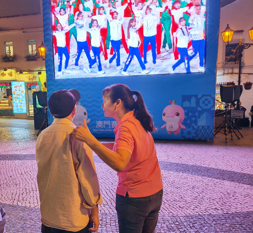 第十五屆全運會開幕前幾天,店門口的小廣場上豎起了一塊巨大的電子屏,這是澳門特區政府為十五運會設置的公共觀賽點。過去這個時間,官也街還靜悄悄的,如今卻已有早起的游客在屏幕前駐足。