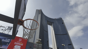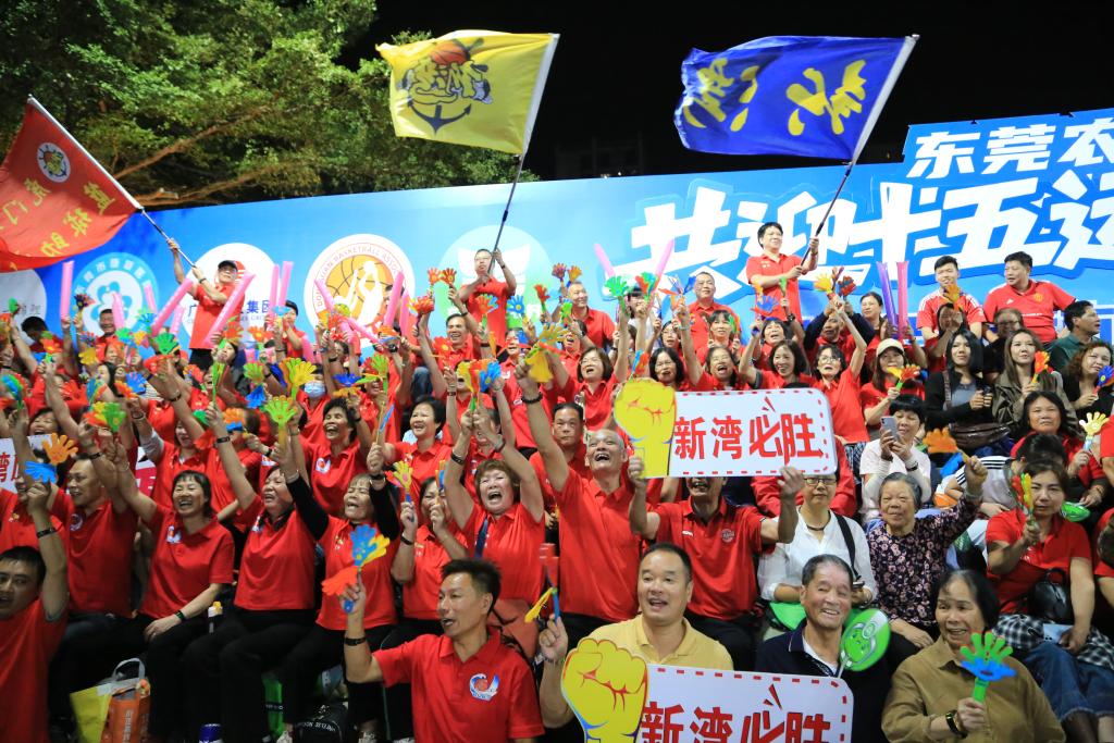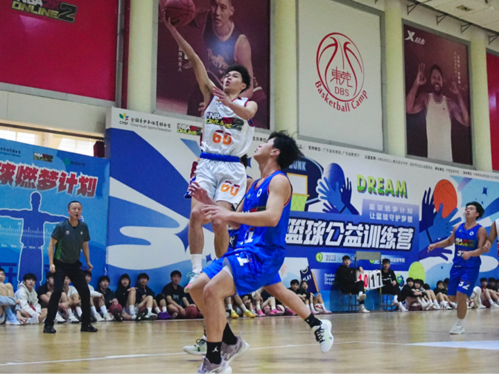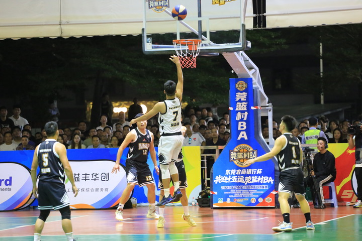 2025“莞籃村BA”賽場,虎門新灣籃球隊7號吳嘉榮上籃瞬間。(謝文玉 攝)