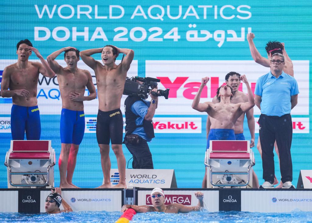 2024年2月16日,中國隊選手王浩宇(右三)、季新杰(右四)、張展碩(右下)在比賽后慶祝。當日,在卡塔爾多哈舉行的2024年世界游泳錦標賽游泳項目男子4X200米自由泳接力決賽中,由季新杰、王浩宇、潘展樂、張展碩組成的中國隊以7分1秒84的成績奪得金牌。 新華社記者 杜宇 攝