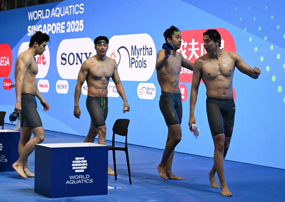 2025年8月1日,亞軍由潘展樂、汪順、張展碩、季新杰(從左至右)組成的中國隊在比賽后。新華社記者 夏一方 攝