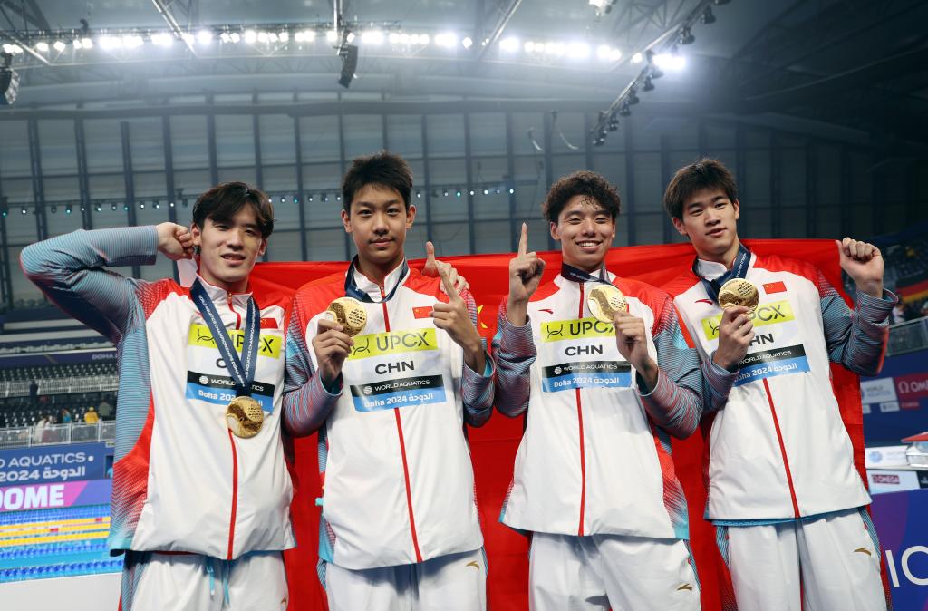 2024年2月11日,中國隊選手王浩宇、張展碩、季新杰和潘展樂(從左到右)在頒獎儀式后合影慶祝。當日,在卡塔爾多哈進行的2024年世界游泳錦標賽游泳項目男子4X100米自由泳接力決賽中,中國隊以3分11秒08的成績奪冠。 新華社記者 雒圓 攝