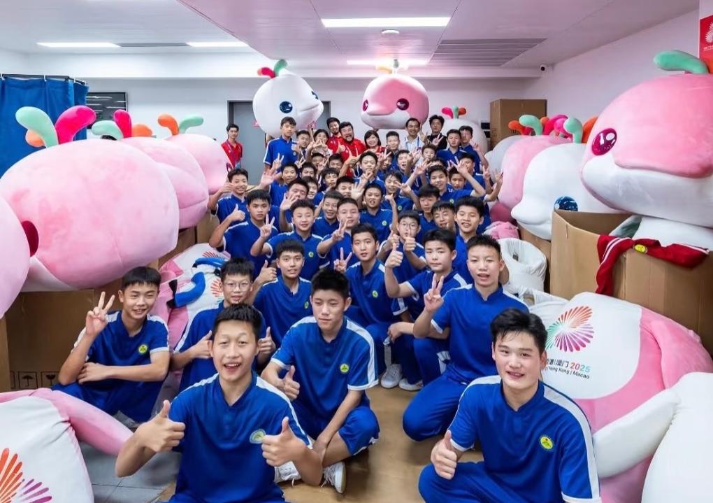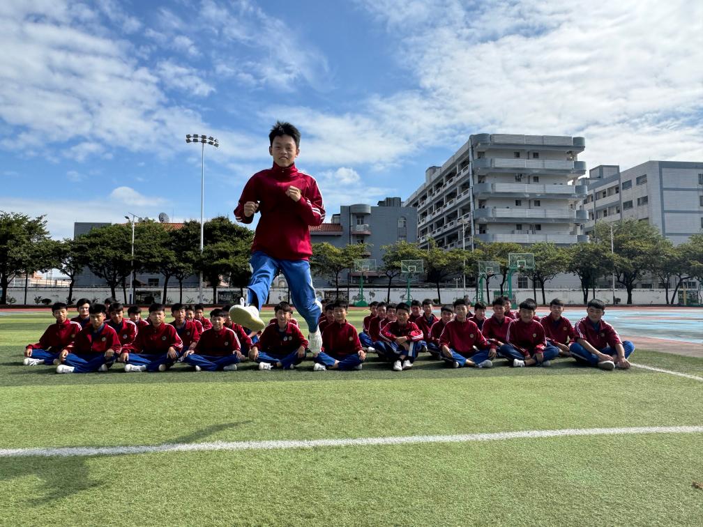 登封市少林鵝坡武校9年級學生張浩瀚展示吉祥物的跳躍動作。新華社記者 楊深深 攝