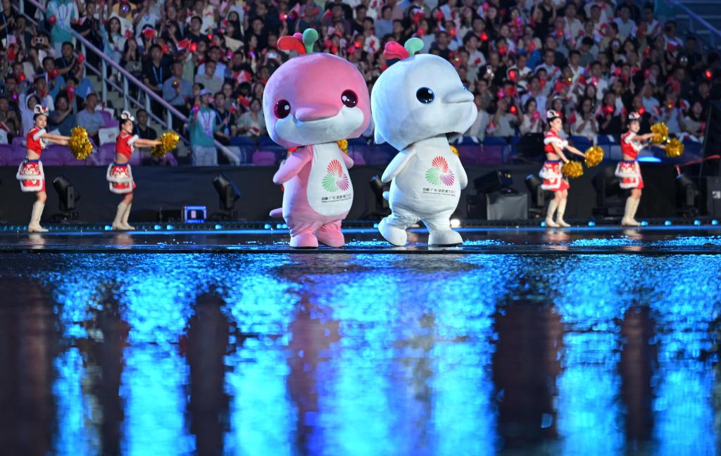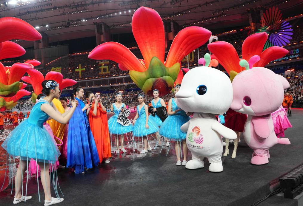 11月9日,第十五屆全國運動會吉祥物“喜洋洋”和“樂融融”在開幕式現場表演。新華社記者 薛宇舸 攝