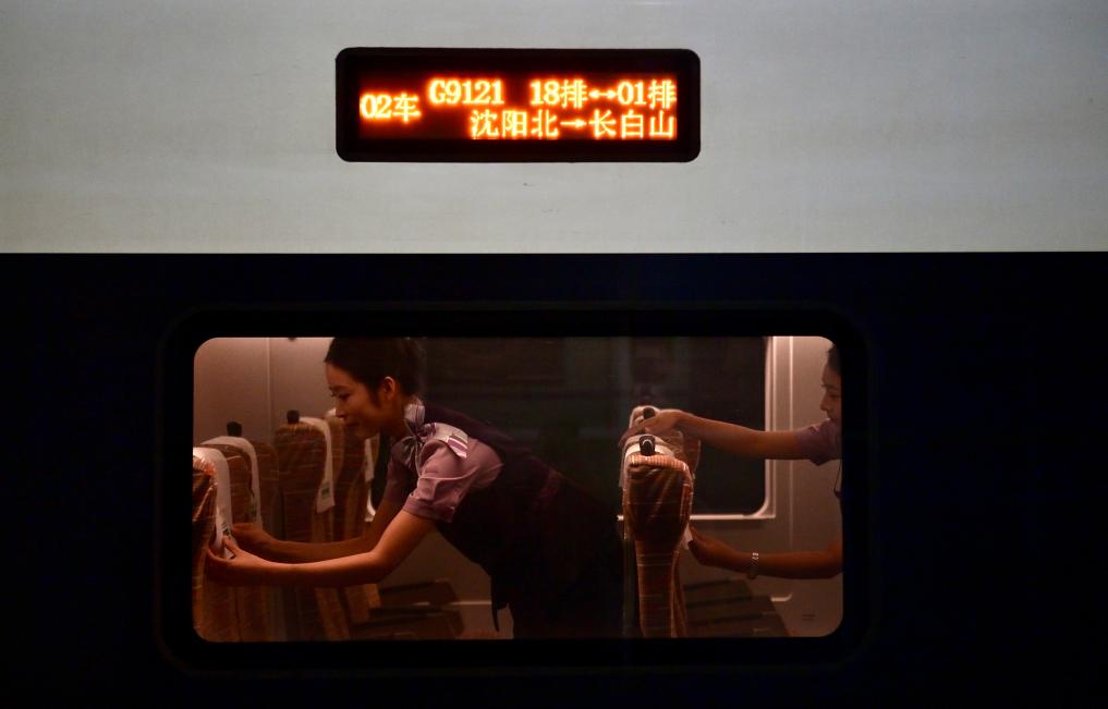 9月4日,沈佳高鐵沈白段開始模擬載客試運行,圖為乘務員在列車上工作。沈白高鐵作為中國東北高鐵網重要組成部分,該線路對暢通區域經濟循環、促進沿線旅游資源開發等具有重要作用。新華社記者 吳青昊 攝
