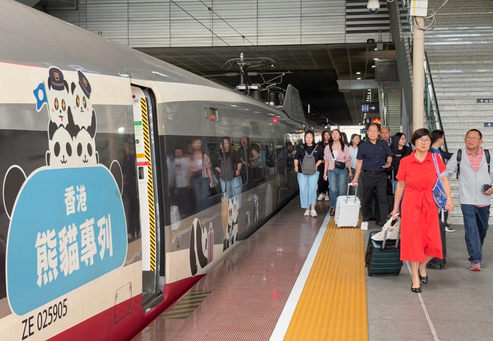 4月27日,往返深港的高鐵列車??吭谏钲诒闭菊九_。新華社發