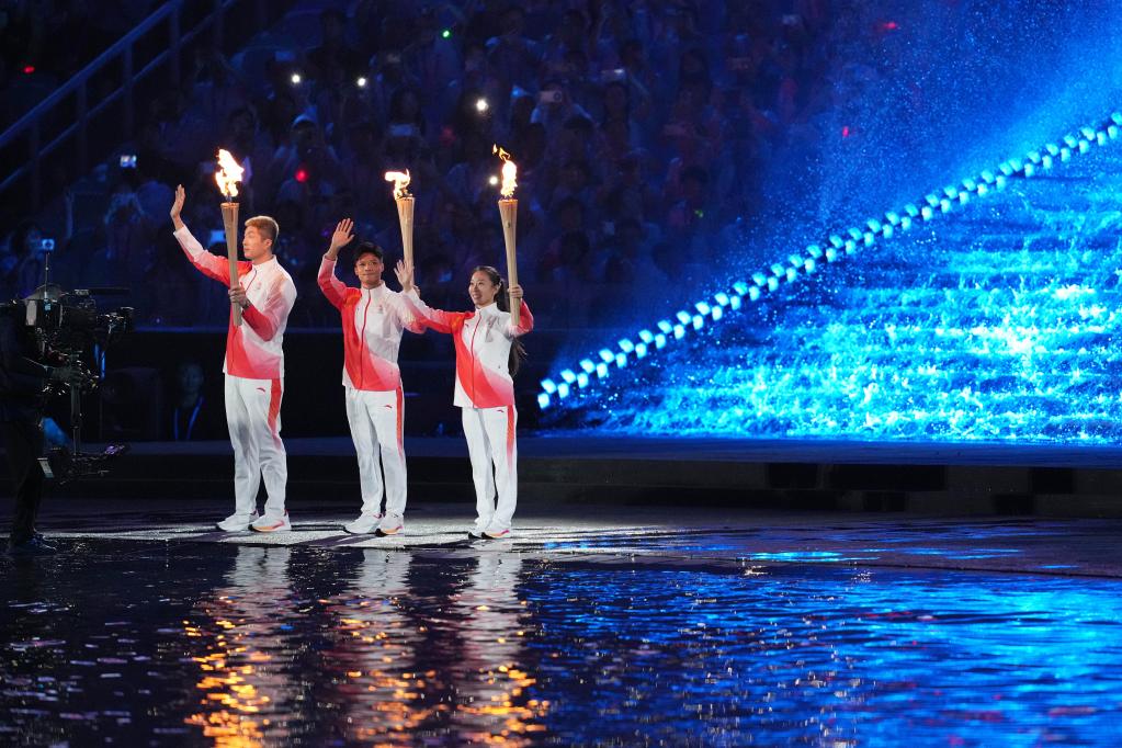11月9日,在第十五屆全國運動會開幕式上,火炬手蘇炳添(中)、張家朗(左)、李祎點燃主火炬后向觀眾致意。新華社記者 肖藝九 攝