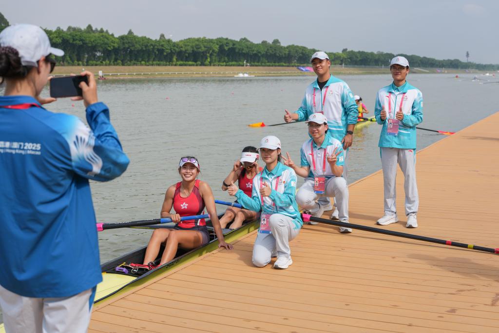 11月8日,香港隊選手黃湘儀/梁瓊允在女子雙人單槳半決賽后與志愿者合影留念。香港隊選手晉級決賽A組比賽。當日,第十五屆全國運動會賽艇項目半決賽在廣州舉行。新華社記者 肖恩楠 攝