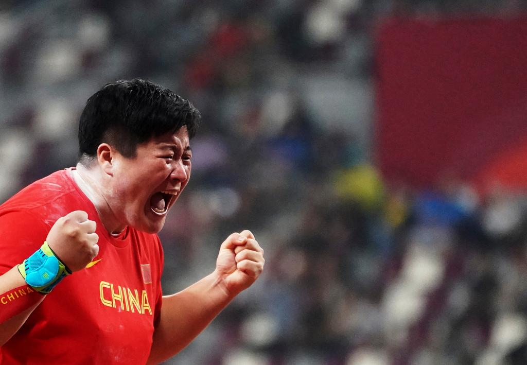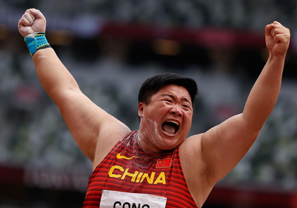 2021年8月1日,鞏立姣在東京奧運會田徑女子鉛球決賽后慶祝勝利。
