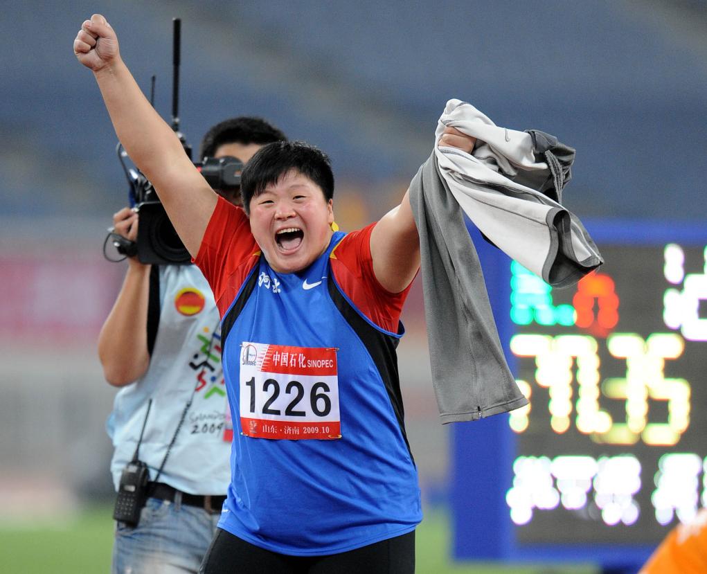 2009年10月21日,鞏立姣在第十一屆全國運動會田徑項目女子鉛球決賽后慶祝勝利。