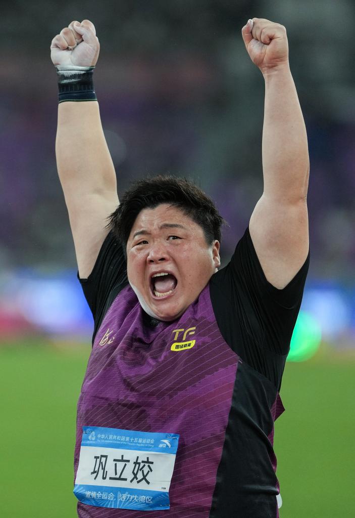 2025年11月16日,河北隊選手鞏立姣在第十五屆全國運動會田徑女子鉛球決賽中奪冠后慶祝。