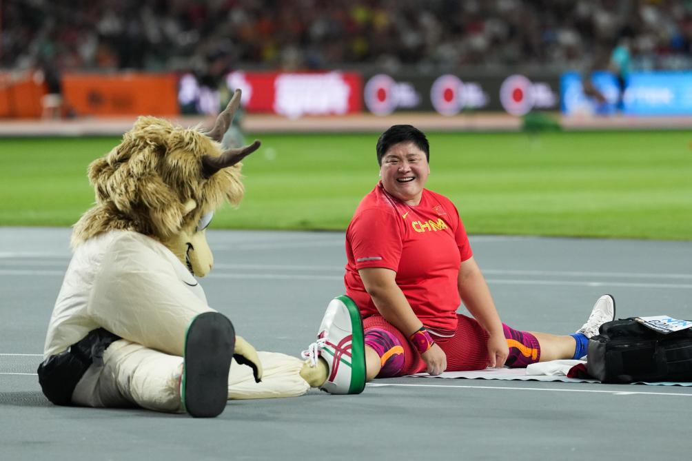 2023年8月26日,鞏立姣在世界田徑錦標賽女子鉛球決賽前與吉祥物一起熱身。