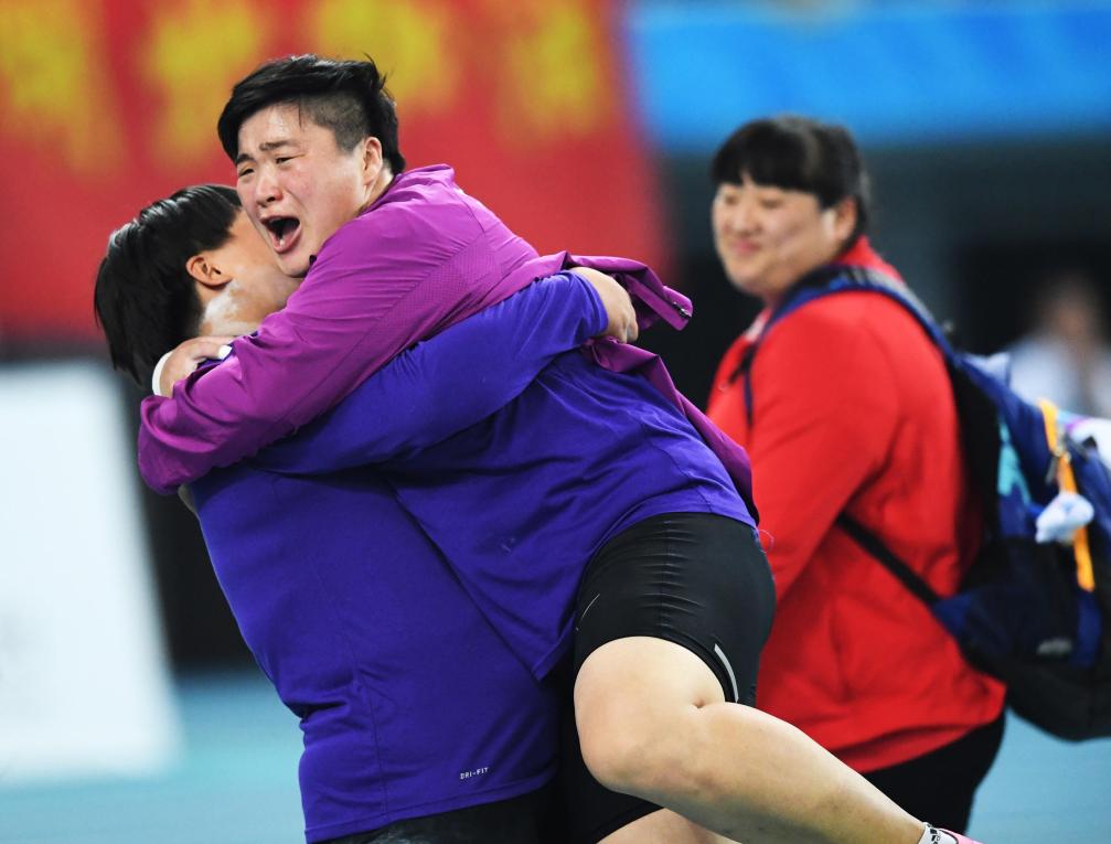 2017年9月6日,鞏立姣(中)在第十三屆全國運動會田徑項目女子鉛球決賽后慶祝。