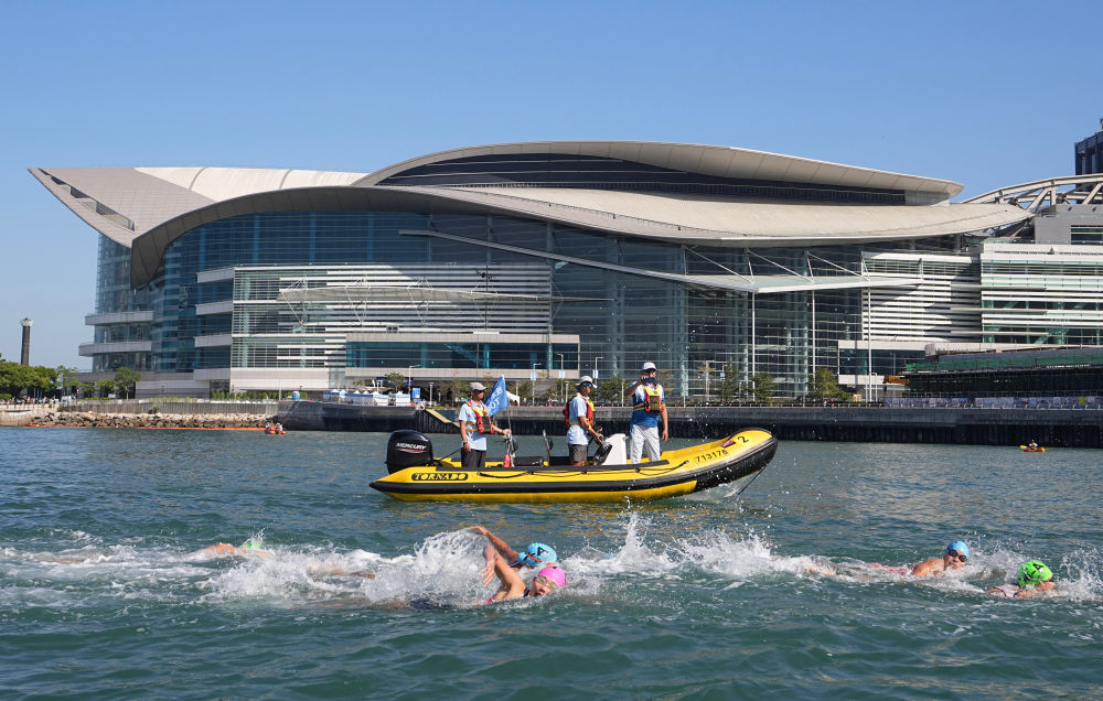 11月16日,參賽選手在游泳比賽中。當日,在香港舉行的第十五屆全國運動會鐵人三項混合接力決賽中,山東隊獲得冠軍,香港隊獲得亞軍,中國公安體育協會隊獲得季軍。新華社發(呂小煒攝)
