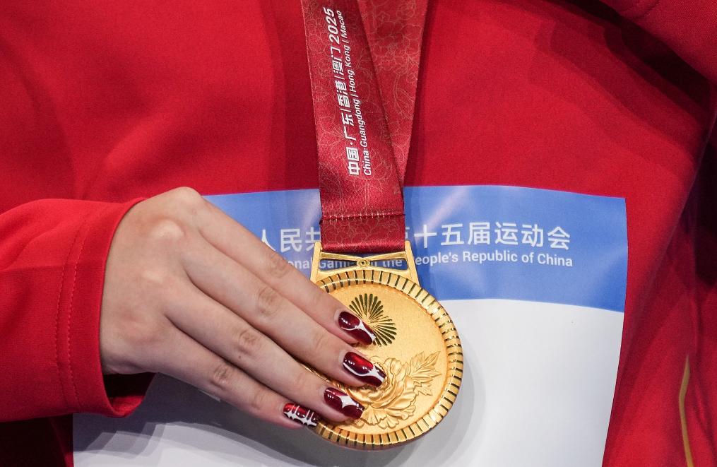 11月14日,冠軍江西隊選手萬樂天在女子50米仰泳頒獎儀式上。