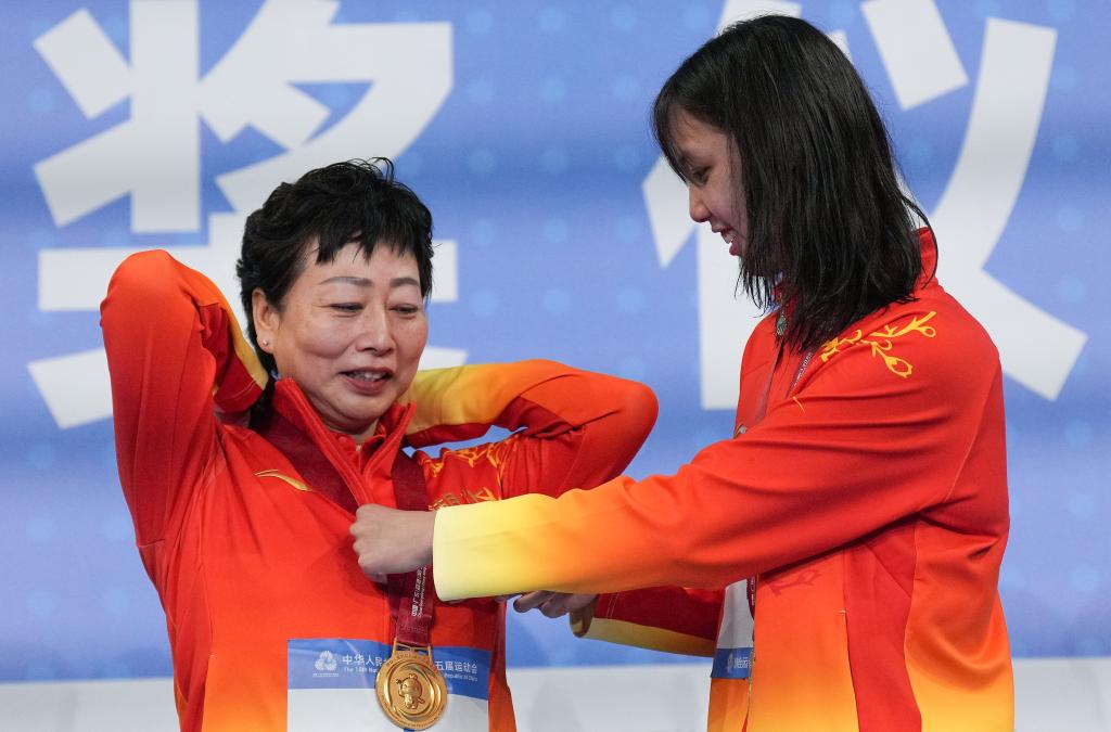 11月12日,冠軍湖北隊選手彭旭瑋(右)和教練在女子100米仰泳頒獎儀式上。