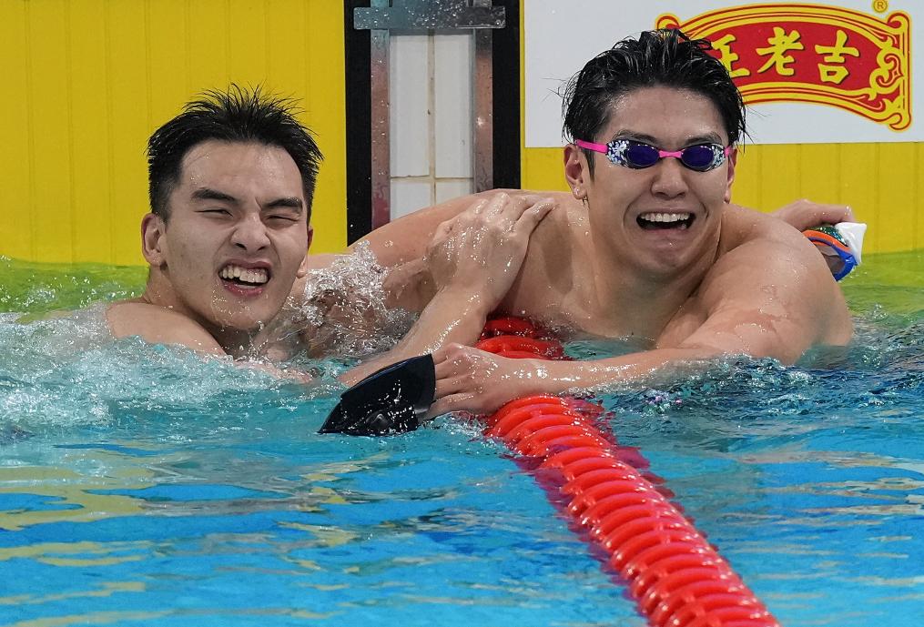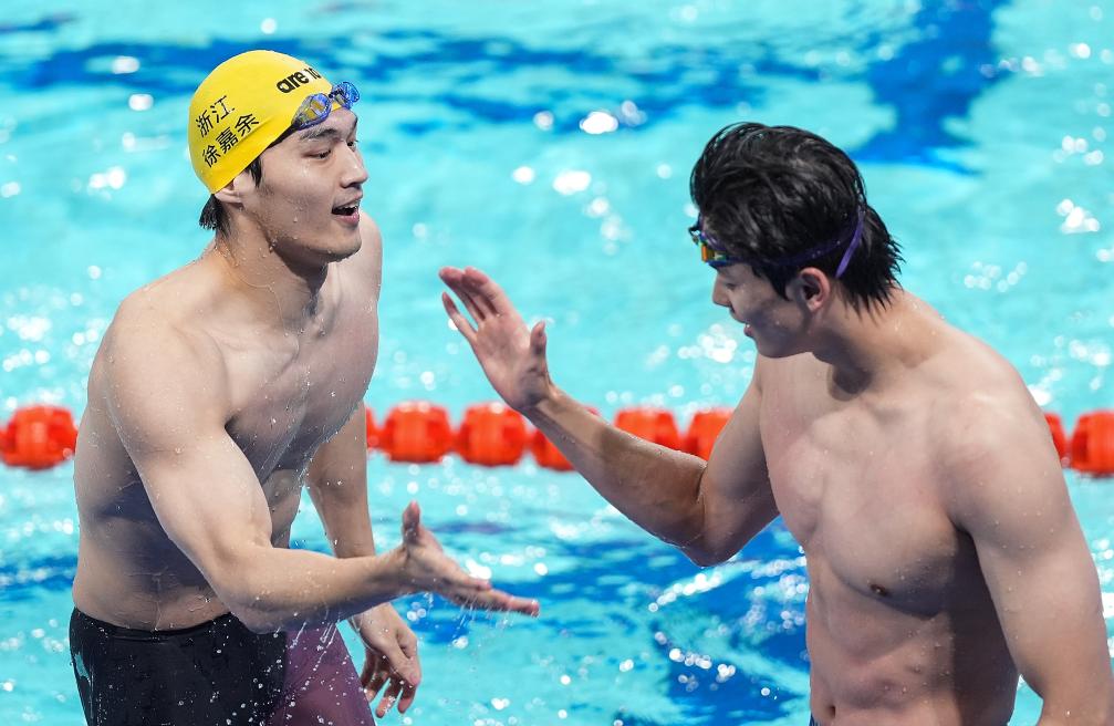 11月13日,上海隊選手鄭英昊(左)與江蘇隊選手董志豪在男子50米蛙泳決賽后。