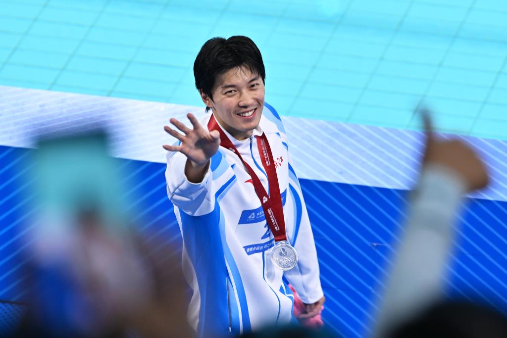 11月15日,浙江隊選手汪順在男子4X200米自由泳接力頒獎儀式后向觀眾致意。