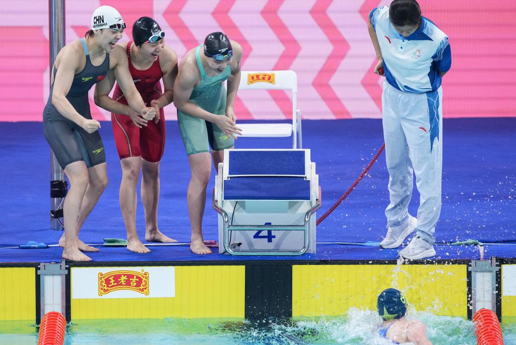 11月14日,河北隊選手馬永慧、張可、于子迪(上,從左至右)在李冰潔(下)觸壁時慶祝女子4X200米自由泳接力奪冠。