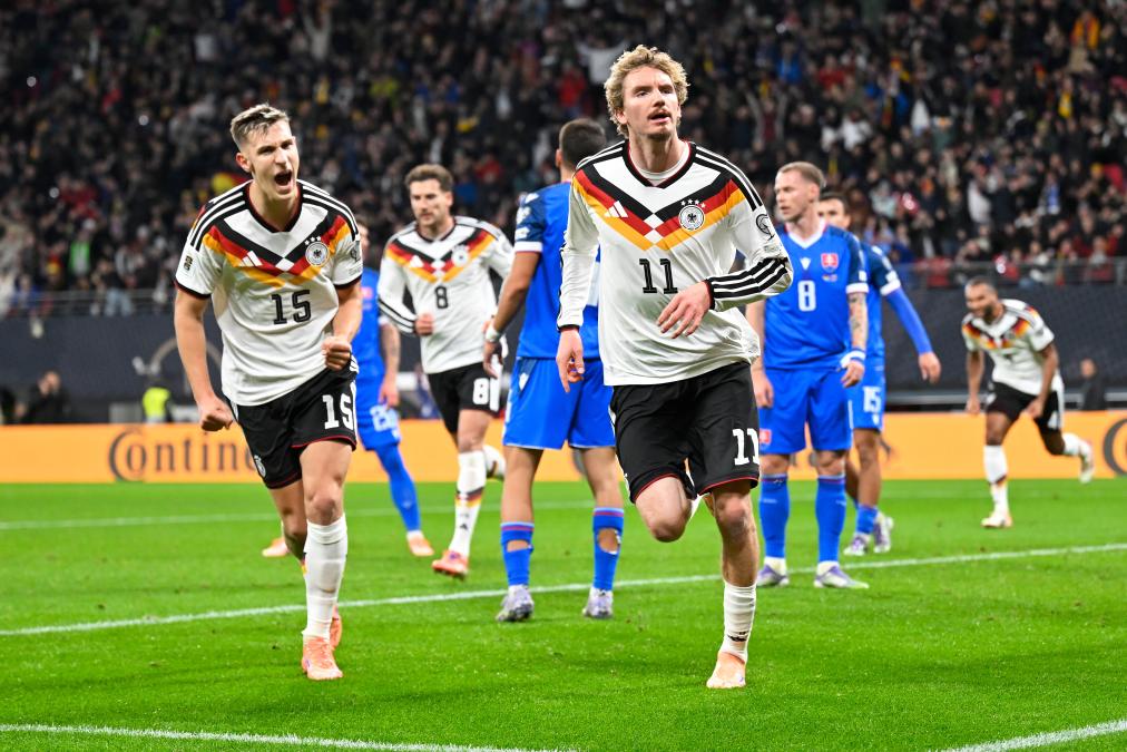 11月17日,德國隊球員沃爾特馬德(前右)慶祝進球。當日,在德國萊比錫舉行的2026年美加墨世界杯歐洲區預選賽第一階段小組賽第十輪比賽中,德國隊主場6:0戰勝斯洛伐克隊。新華社發(烏爾里?!ず蚣{格爾攝)
