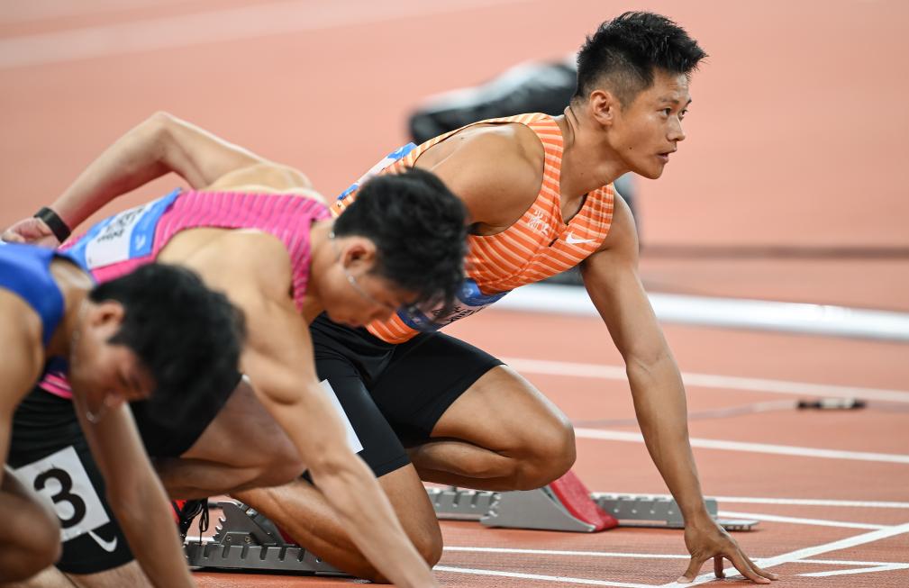 2025年11月17日,第十五屆全國運動會田徑男子100米復賽,浙江隊選手謝震業(右)準備起跑。最終,他無緣決賽。新華社記者 肖藝九 攝